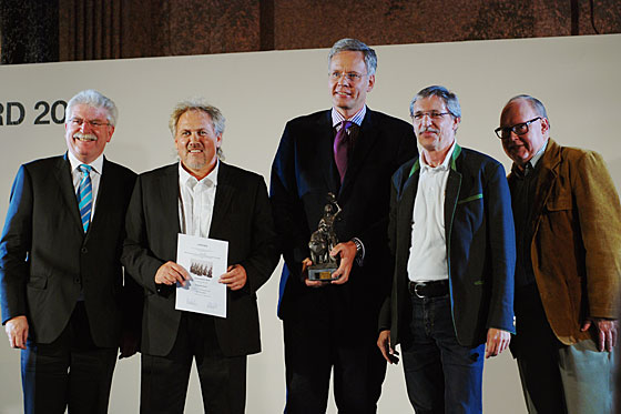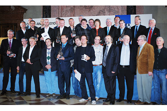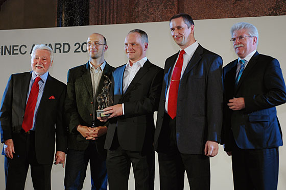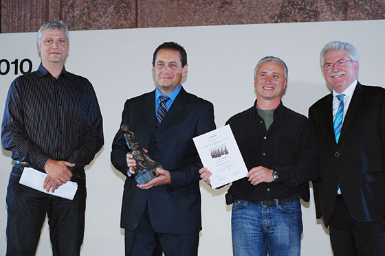 Die Preisträger in der Kategorie Camera Equipment für CineMonitor HD 3D View Evolution mit Staatsminister Martin Zeil und Jury-Mitglied Peter Claridge, München