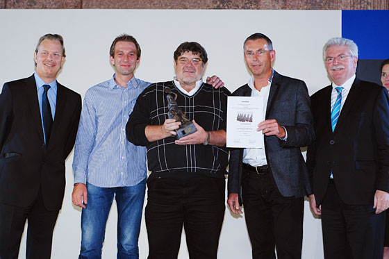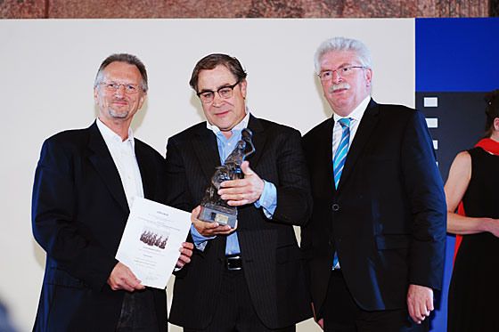 Die Preisträger in der Kategorie Camera Support/Grip für den Gyro-stabilized camera crane RUSSIAN ARM mitStaatsminister Martin Zeil und Jury-Mitglied Nils Maier, Köln