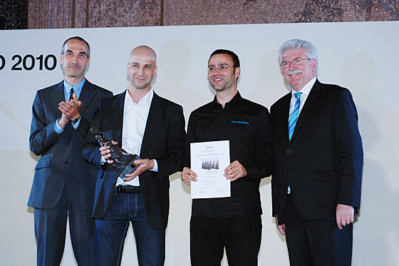 Die Preisträger in der Kategorie Lighting Engineering für das LT-Sky-Light mit Staatsminister Martin Zeil und Jury-Mitglied Stuart Gain