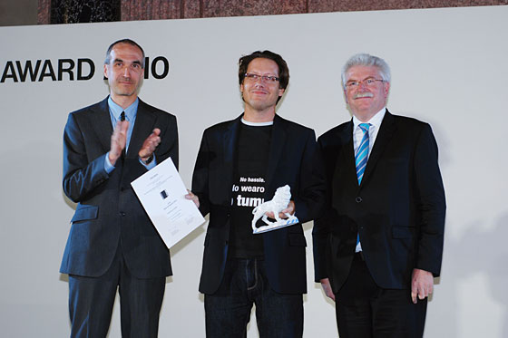 Der Preisträger Special Award für die clevere Idee/Kategorie Lighting Engineering für den DoPChoise Snapgrids mit Staatsminister Martin Zeil und Jury-Vorsitzendem Prof. C. Slansky (HFF München)